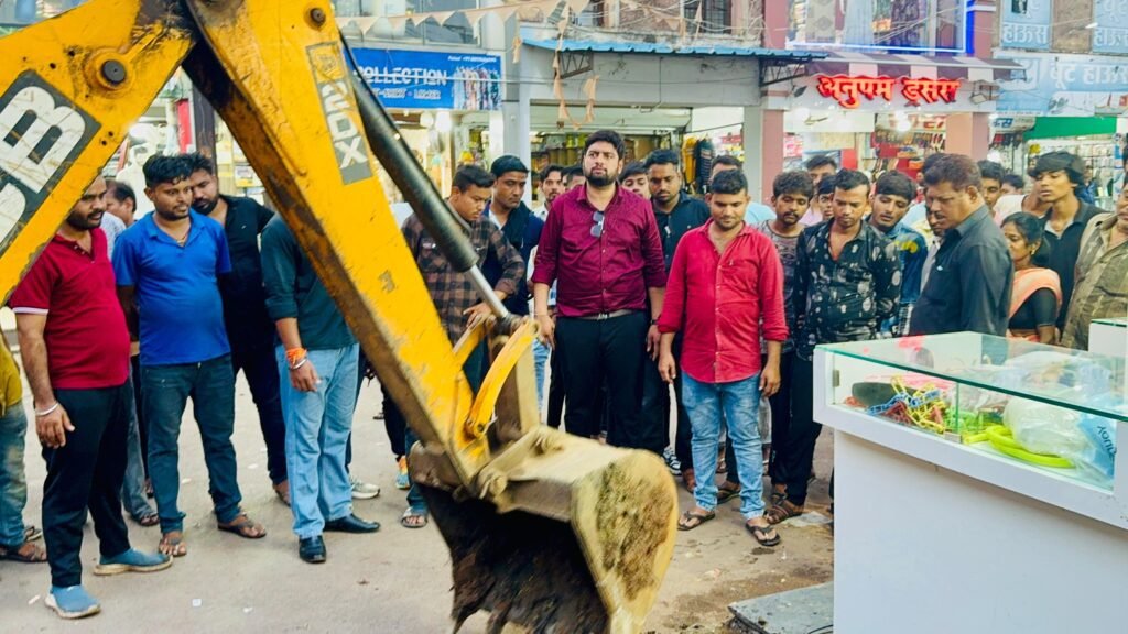 इंदिरा मार्केट के व्यवसायियों ने नाली के उपर अतिरिक्त निर्माण कर सीढ़ी, चबूतरा व सामान रखने के लिए बनाया रैम्प,चला बुलडोजर।