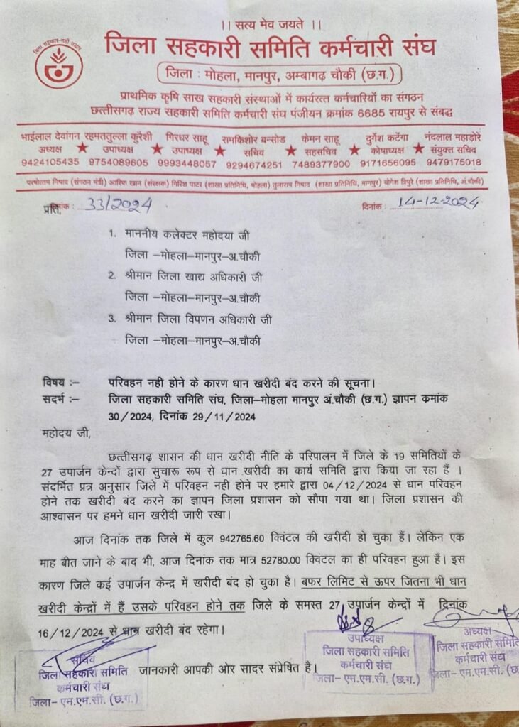 धान की परिवहन समय पर नहीं होने से प्रबंधकों को सुखत की चिंता भी सताने लगी है। एक माह बीत जाने के बाद परिवहन नहीं होने के कारण समिति प्रबंधकों द्वारा 16.12.2024 से जिले में धान खरीदी बंद करने का ऐलान किया गया है ।ज्ञात होगी 29 नवंबर 2024 तक धान की परिवहन की शुरुआत नहीं होने के चलते प्रबंधकों द्वारा ज्ञापन सौंप कर 4 दिसंबर 2024 से धान खरीदी बंद करने का एलान किया गया था। 4 तारीख को जिले के 27 उपार्जन केंद्र में खरीदी बंद रहा , जिला प्रशासन के द्वारा आश्वासन दिए जाने के बाद 5 दिसंबर से पुनः खरीदी प्रारंभ किया गया ,लेकिन विडंबना यह है कि जिले में खरीदी के अनुपात में परिवहन नाम मात्र होने के चलते प्रबंधकों को मजबूरी में धान खरीदी बंद करने का फैसला लेना पड़ा है।सुखत की सुखद देने की मांग:- समिति प्रभारी ने शासन से मांग की है कि एक माह तक परिवहन नहीं होने के कारण धान में सुखत आना लाजमी है इसलिए शासन उसमें सुखत प्रदान करें । सभी 27 उपार्जन केंद्रों में शासन द्वारा तय की गई बफर लिमिट से 5-6 गुणा धान खरीदी केदो में पड़ा हुआ है ।