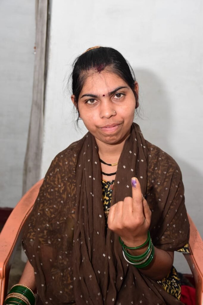 दिव्यांग अहिल्या ने मतदान दल के घर आने पर जाहिर की खुशी।