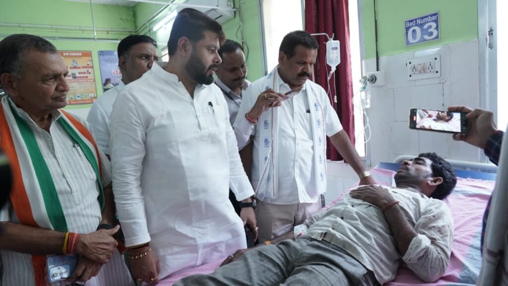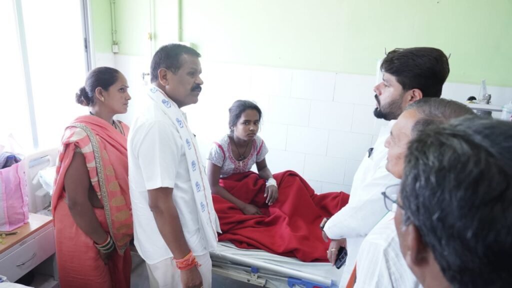 कठिया ग्राम में हर दर्दनाक सड़क दुर्घटना में घायलों से कुशलक्षेम पूछने पहुँचे राजेन्द्र साहू।